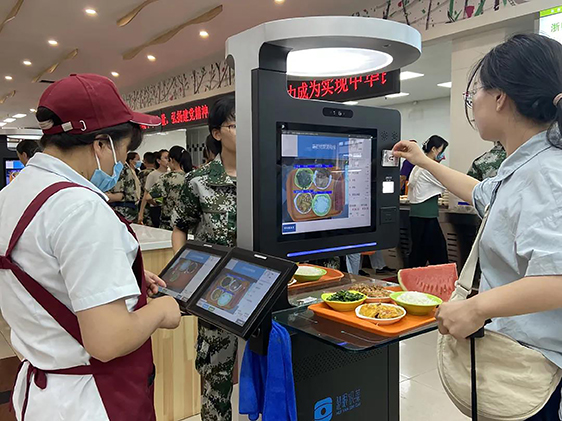 打餐后,只需把托盤(pán)放置結(jié)算區(qū),AI結(jié)算臺(tái)將自動(dòng)識(shí)別菜品,自動(dòng)計(jì)價(jià),師生可以通過(guò)刷臉、刷卡、掃碼,完成支付。